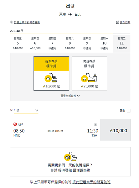 目前選擇的日期只有一個航班有位置(每天二班)