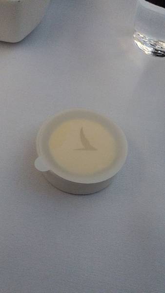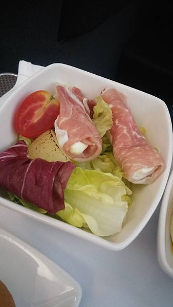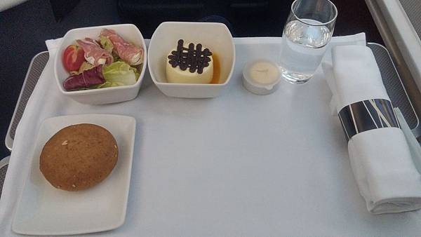 從左下開是順時鐘為雜糧麵包(冷)、煙燻火腿佐乳酪起司的沙拉、甜點、奶油(讚)、水、以及餐具