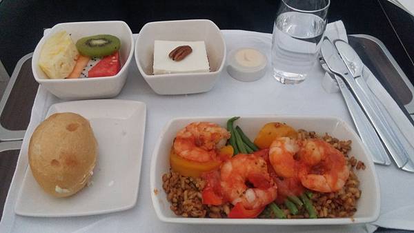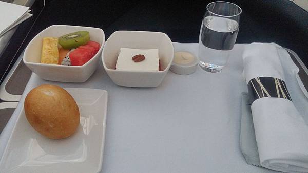 從左到右有餐包、水果、甜點奶油、杯水及餐具